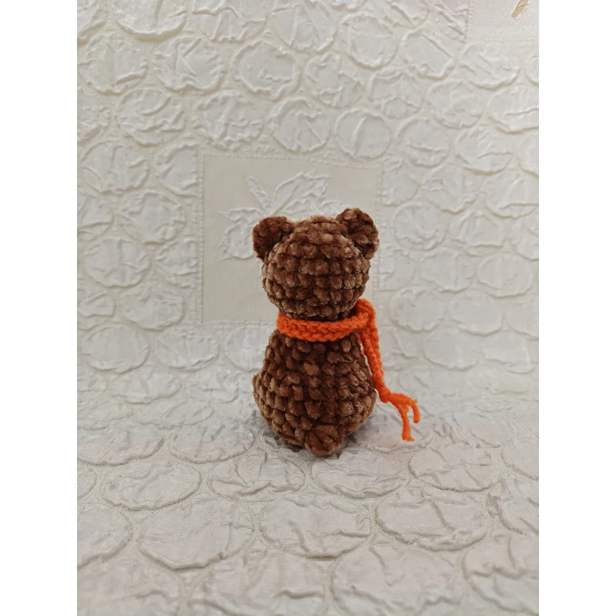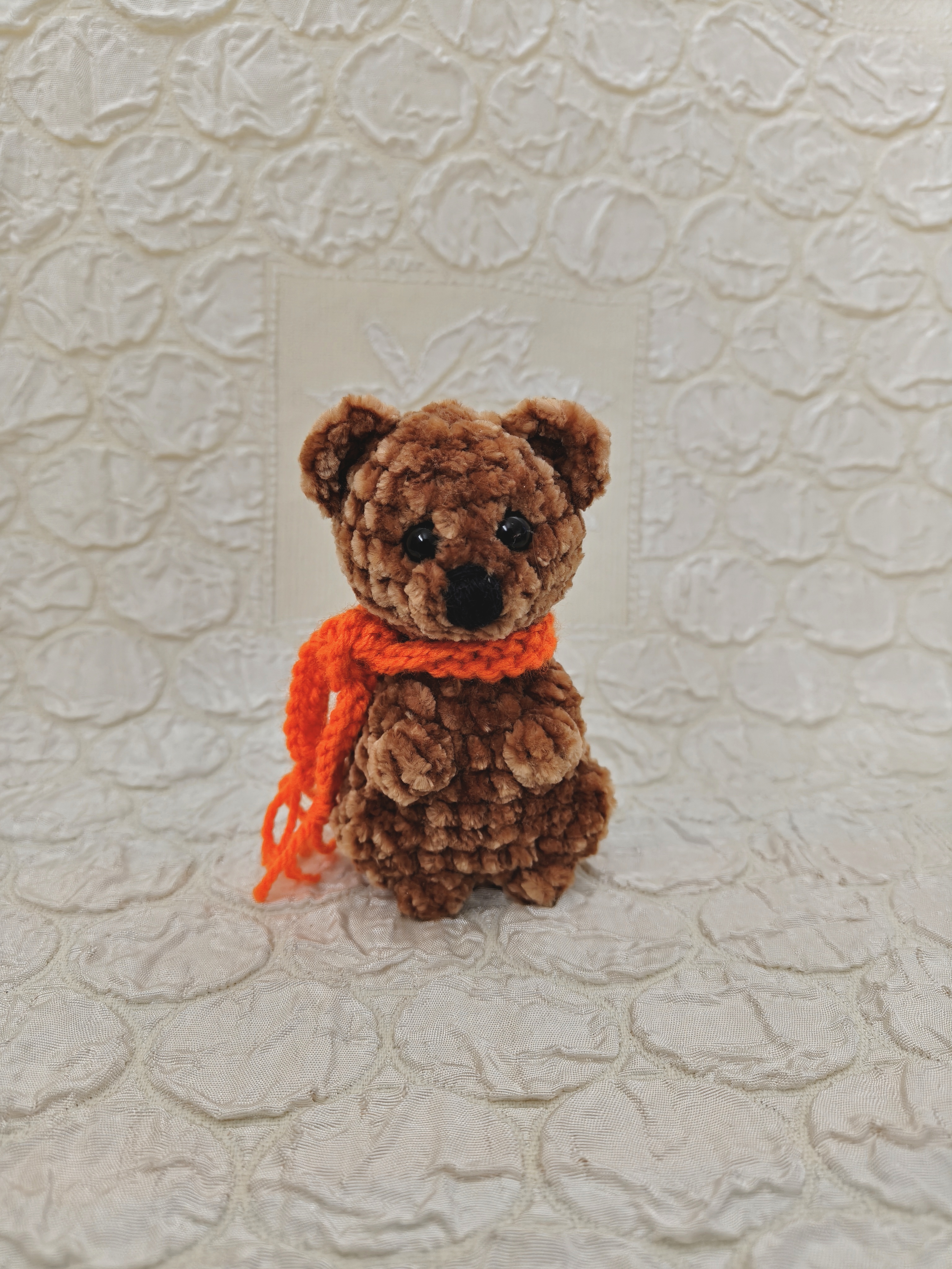 This little Teddy Bear looks like a gentle soul: soft, plushy fur, curious eyes, and that bright orange scarf keeping him warm. He feels like the kind of bear who quietly watches the world, ready for cuddles and small adventures.